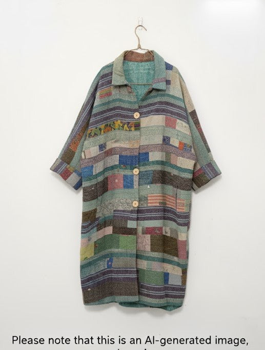 coThis reversible jacket is a tribute to wanderers and collectors of quiet moments — one side awash in deep teal and violet blocks, the other alive with eclectic patchwork pieced from stories of many hands and homes. Handcrafted from vintage cotton kantha, it’s a seasonless layer that feels both grounding and joyfully unexpected, carrying the spirit of journeying, mending, and becoming.