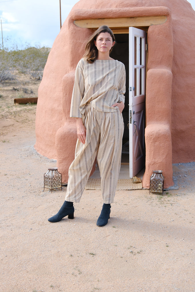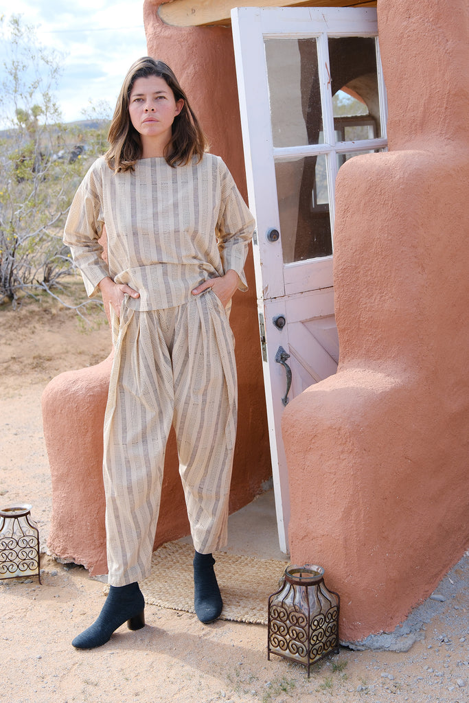 Designed in collaboration with Meredith Peck, these stylish trousers are decorated with a striking, all-over vertical striped and dotted pattern. They feature a comfortable, elasticized waist at back and deep pleats that create a relaxed, voluminous silhouette which gracefully tapers at the ankle. Complete with convenient side and back pockets, this piece is perfect for a chic daytime look when paired with a simple tee or tank.