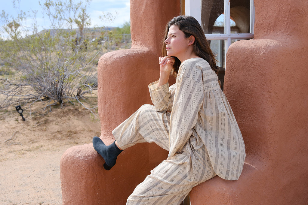 Our fabrics are crafted from natural materials, including 100% hand-woven cotton, linen, wool, and silk. We use traditional techniques carried out by skilled artisans. The processes of hand-weaving, hand-dyeing, and hand-block printing are prone to slight irregularities, which make each piece one-of-a-kind.