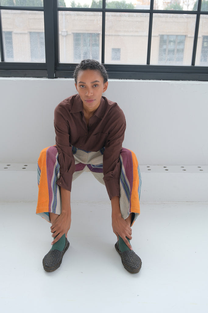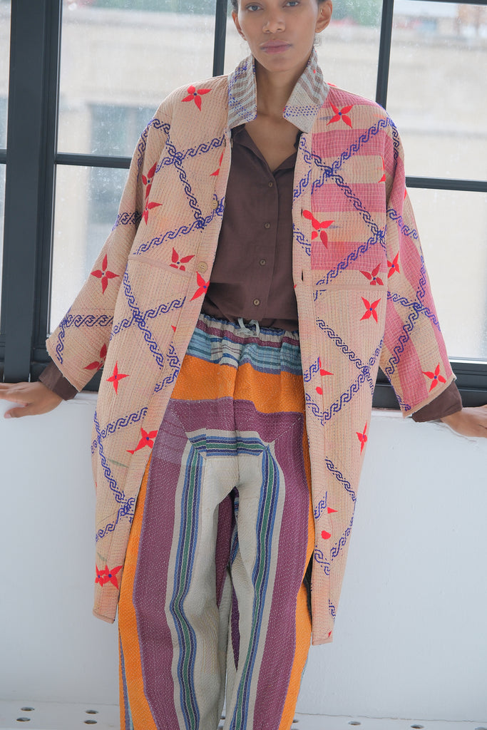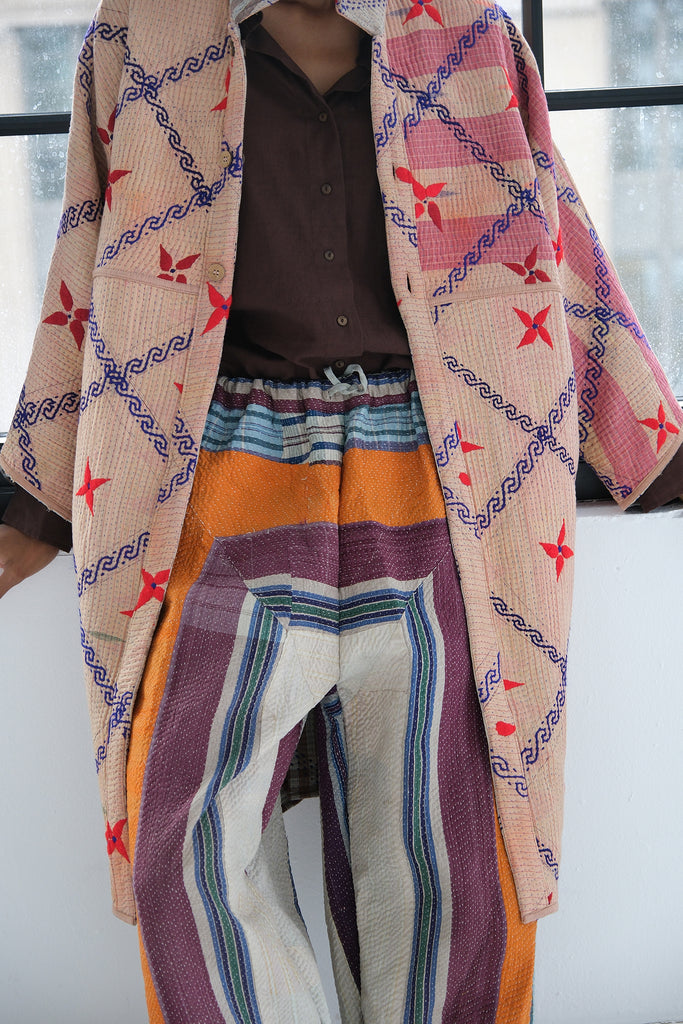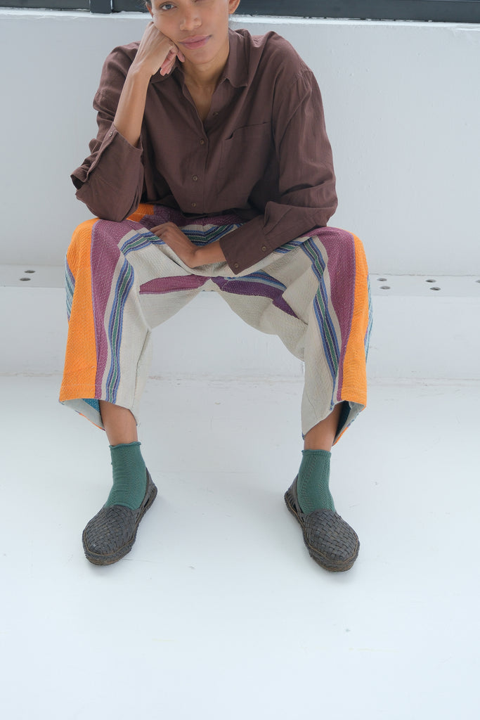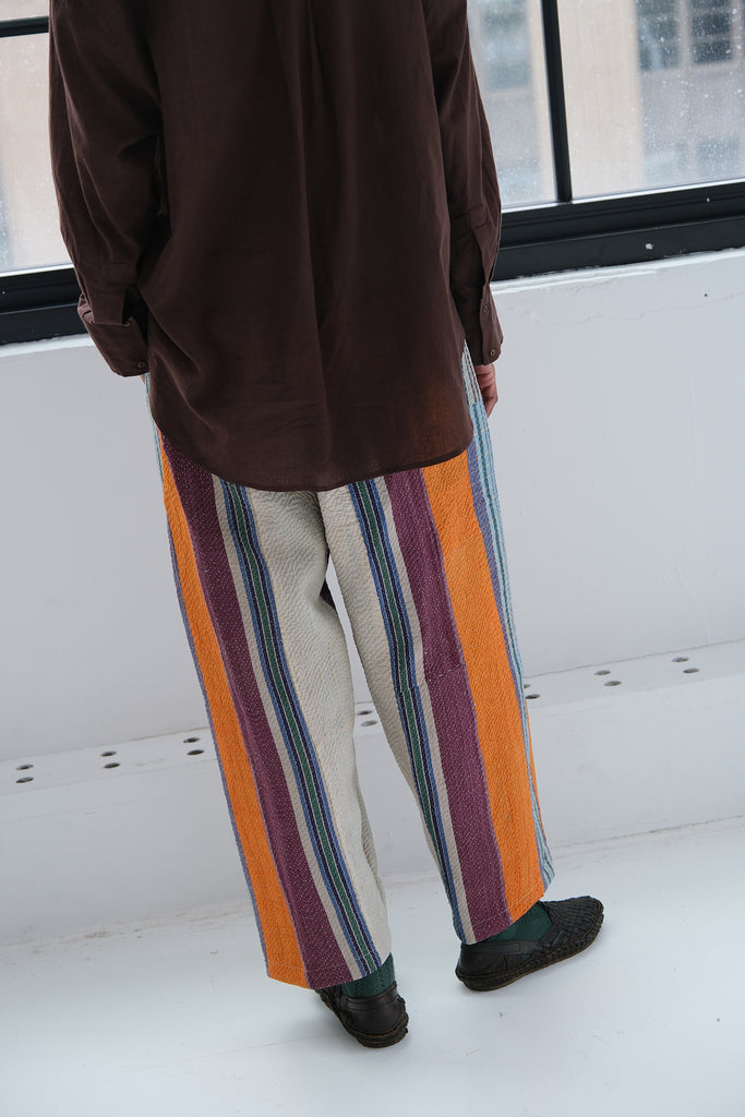 Stitched from vintage, hand-quilted kantha fabric, these unique trousers feature bold vertical stripes in burnt orange, deep plum, and multi-color accents on a cream base. They have a relaxed, drop-crotch (harem) fit and a comfortable elasticated drawstring waist.