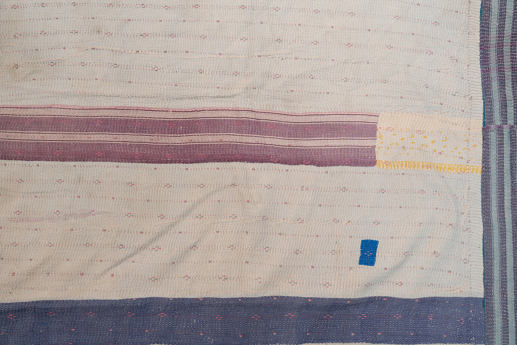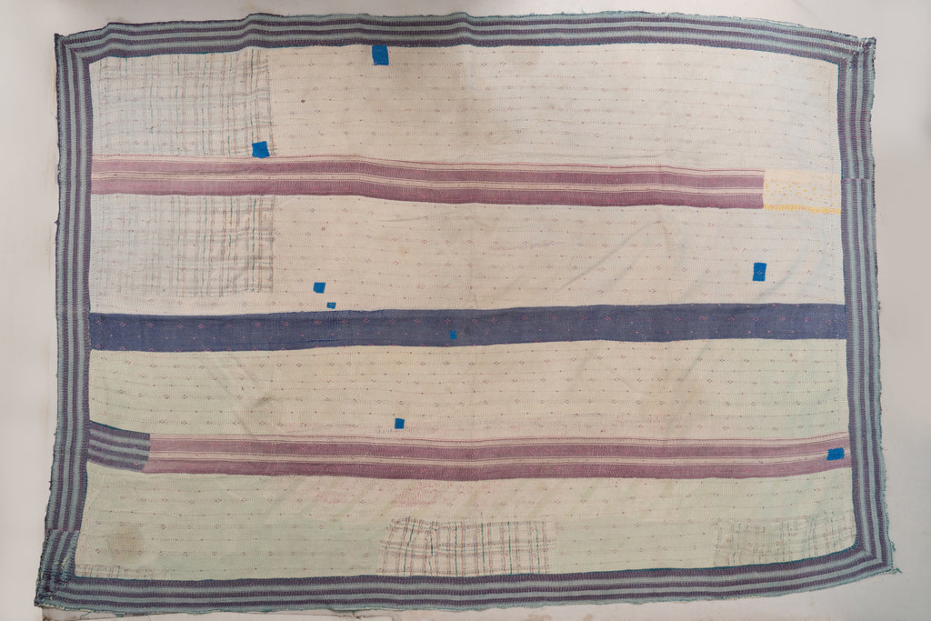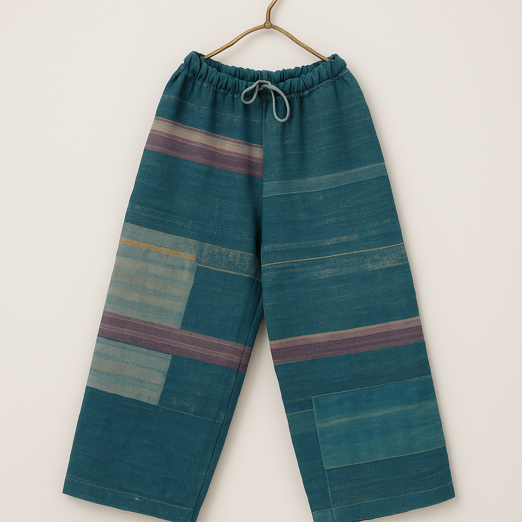 Crafted from vintage kantha quilts, these pants are a study in soft antiquity. A base of pale, airy white is patterned with bold horizontal bands of faded plum and indigo, all framed by a dark, defining border. Subtle check patches and tiny marks of history add to their character, evoking the spirit of slow journeys and handmade beauty. Relaxed, tactile, and effortlessly wearable through the seasons.