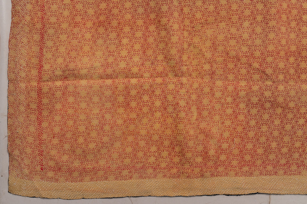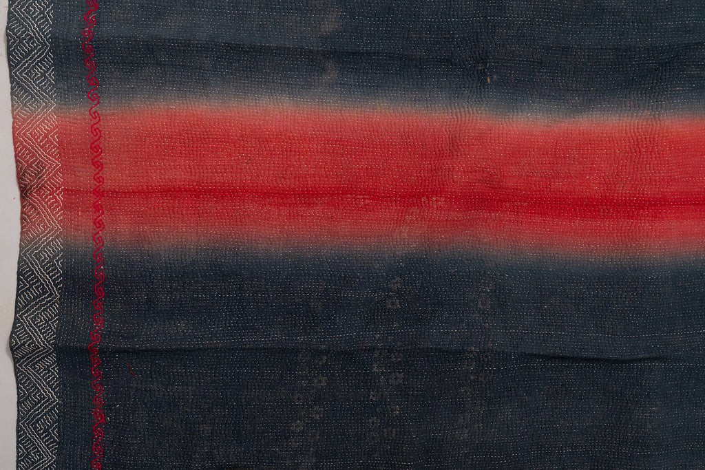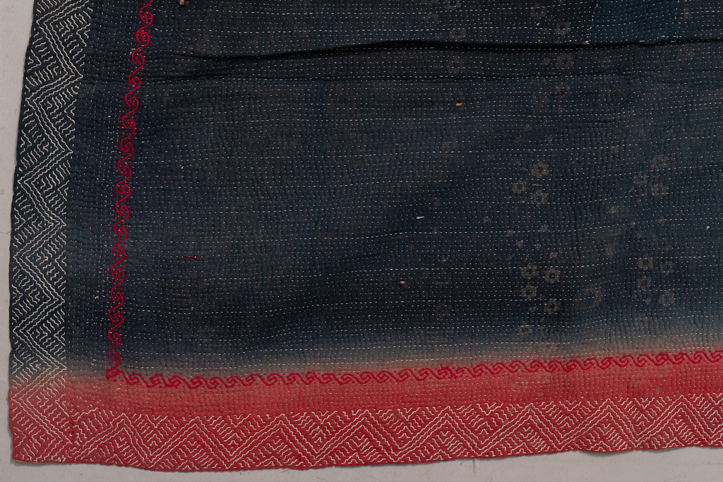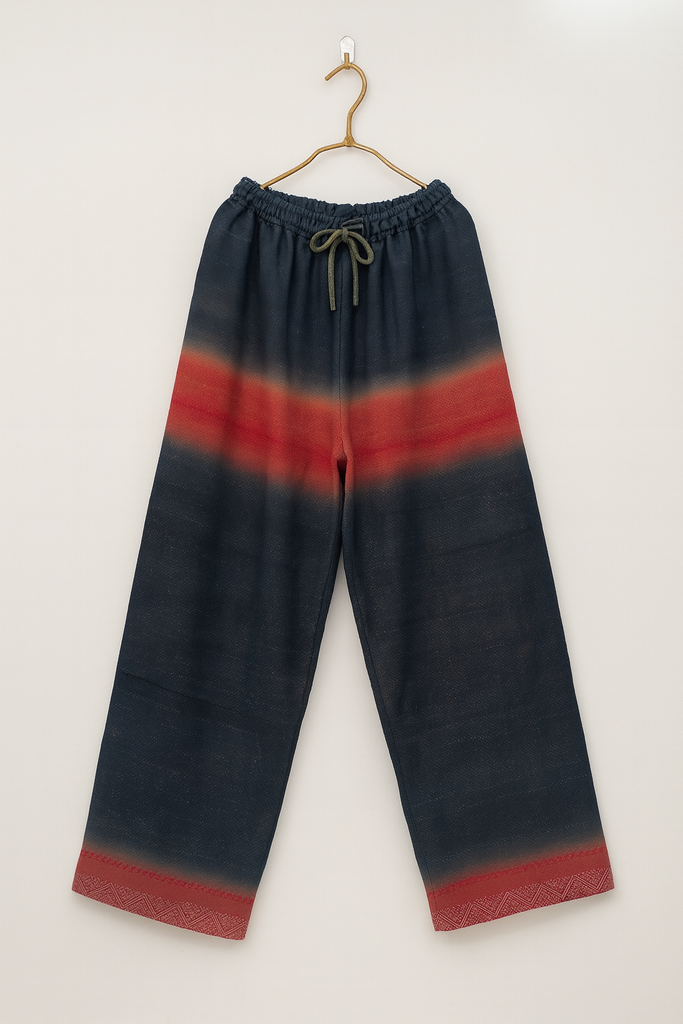 Crafted from vintage kantha quilts, these trousers feature deep charcoal tones washed with time, accented by a soft, sun-faded rust band running across the textile. The result is a piece that feels moody, minimal, and full of lived-in character—perfect for slow days and thoughtful dressing. Relaxed, textured, and seasonless.