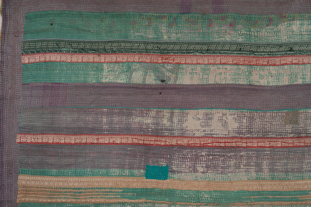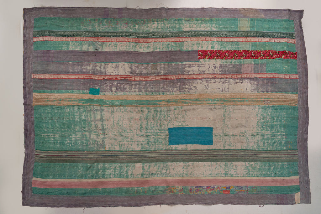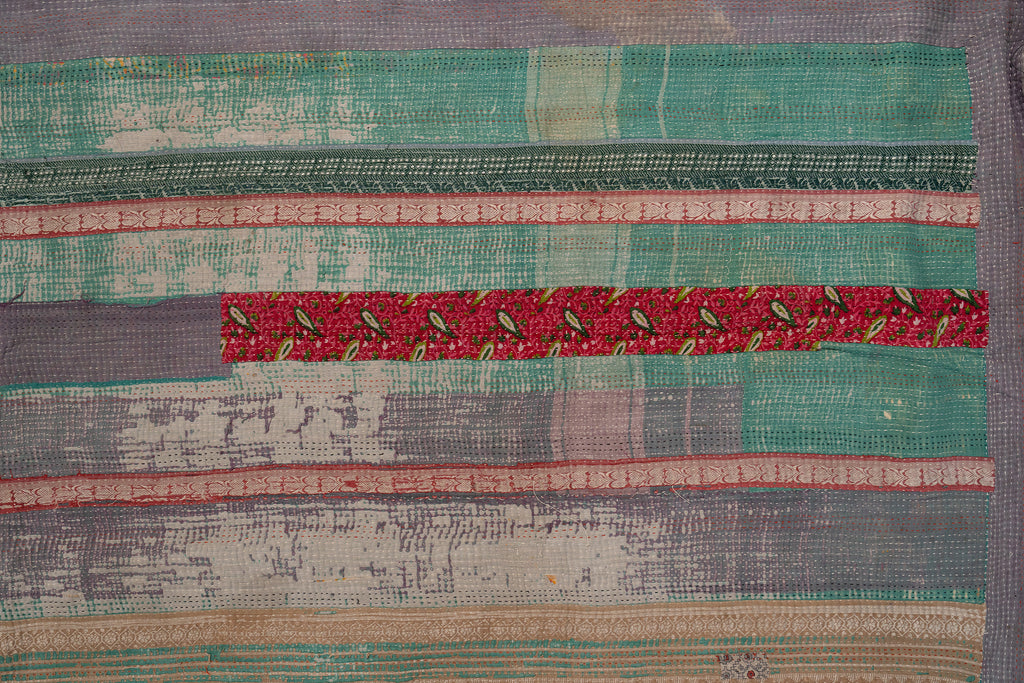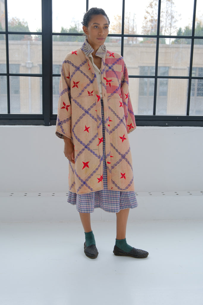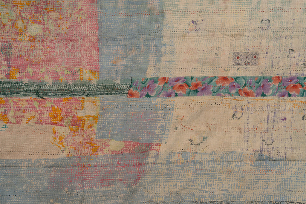 An heirloom made wearable — this jacket is pieced from vintage kantha quilts in washed blues, gentle pinks, and sun-softened florals. Its pastel palette and timeworn texture feel like a quiet afternoon breeze — serene, effortless, and full of soul. Each patch and stitch carries the imprint of many hands and many years, making it a truly one-of-a-kind companion for slow mornings and easy layering.