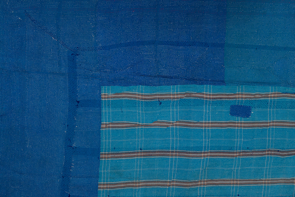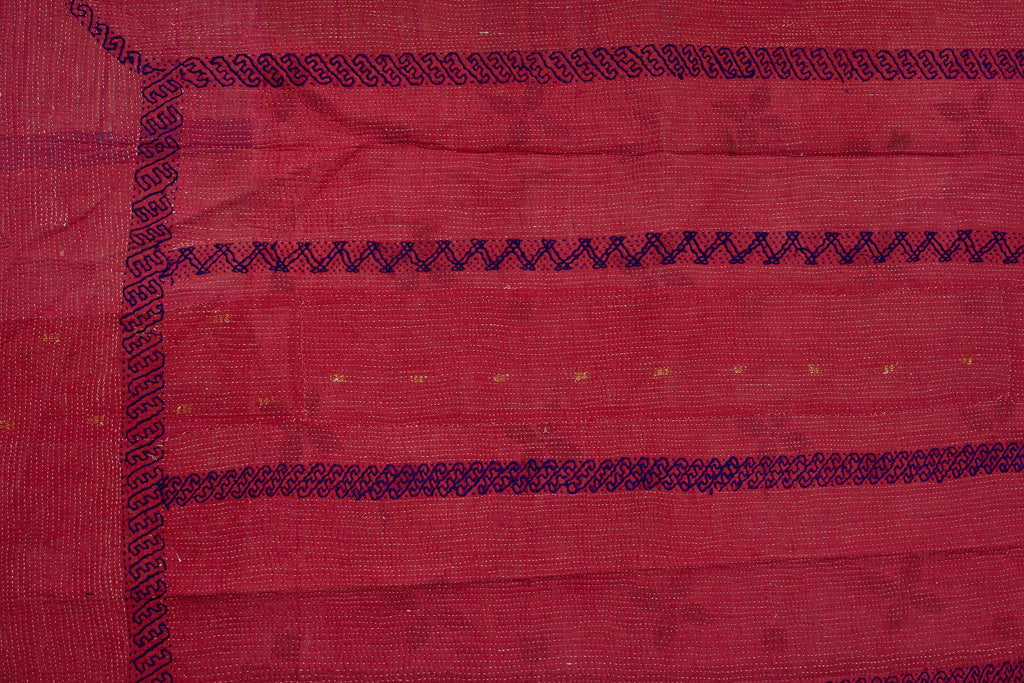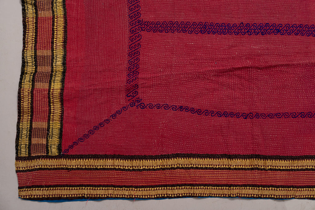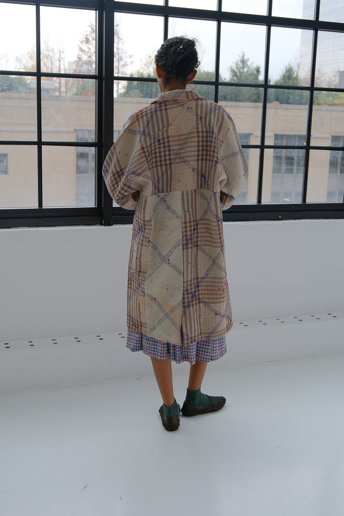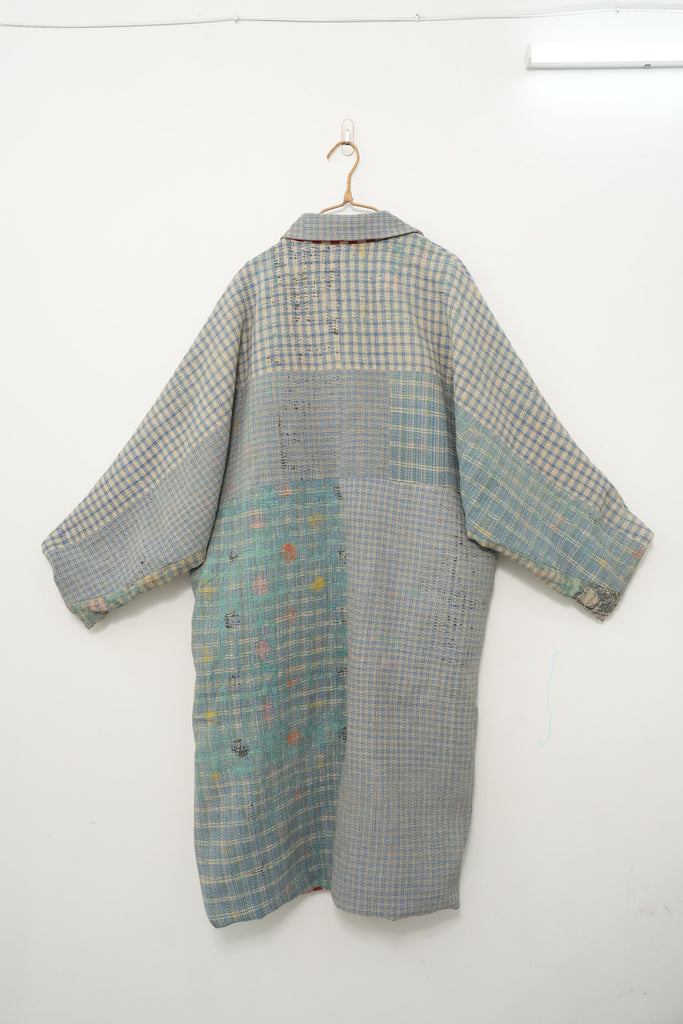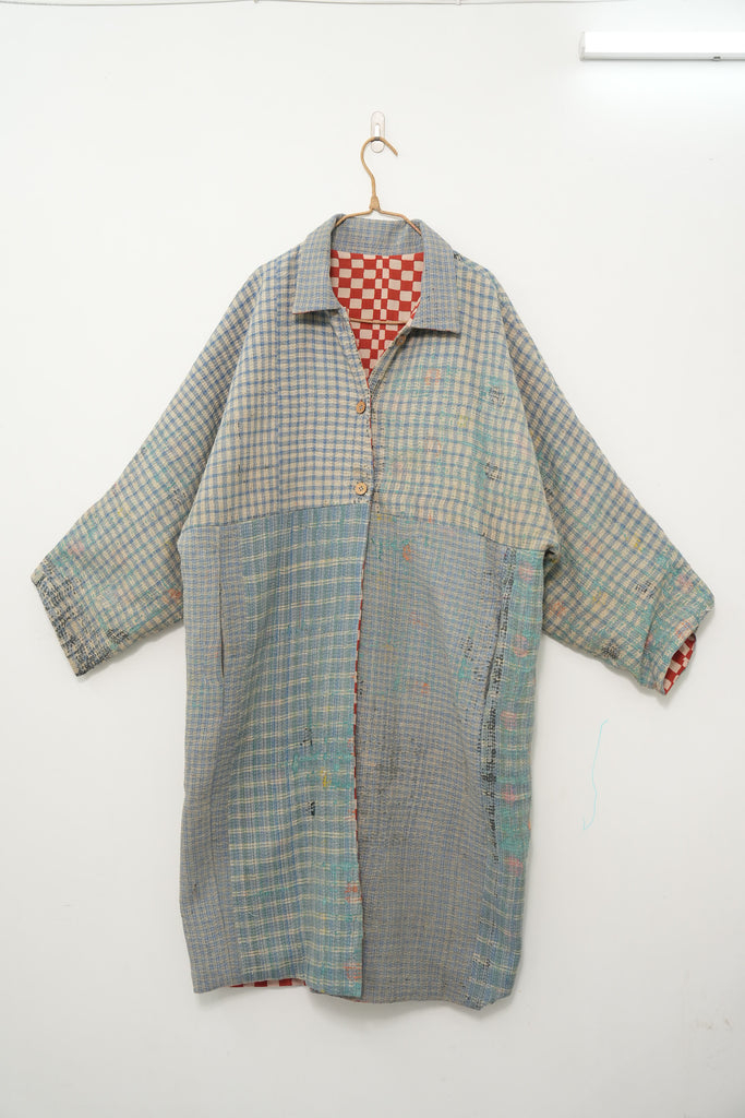 A coat woven in stories — one side awash in ocean blues, the other glowing in deep sunset reds. This reversible piece is crafted from vintage cotton kantha quilts, each layer hand-stitched and time-worn in the most beautiful way. A seasonless companion, it wraps you in warmth, texture, and history with every wear.