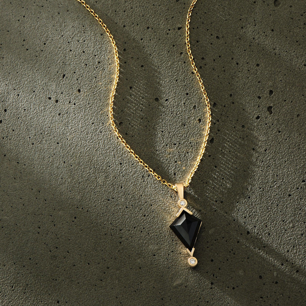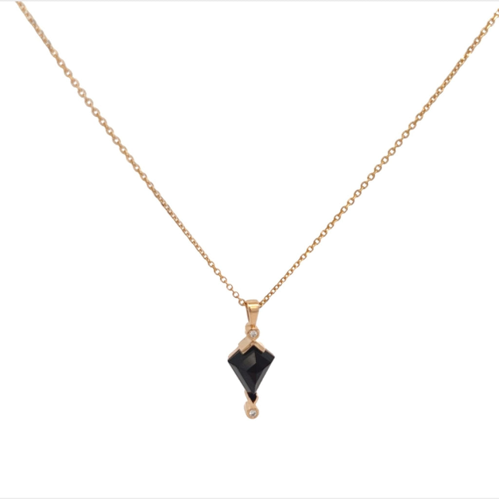 Black spinel kite shaped gemstone is accented with 2 small white diamonds and set in 14k yellow gold. Finished with a solid 14k solid gold cable chain with adjustable link closures at 16" and 18" long.
