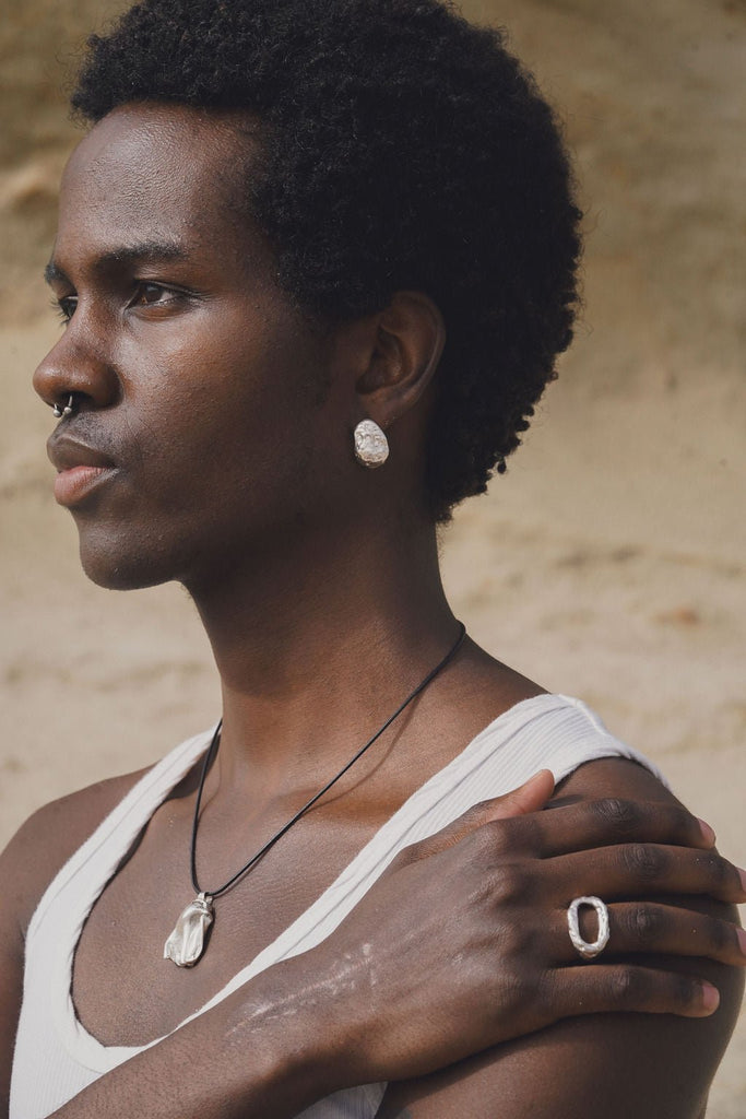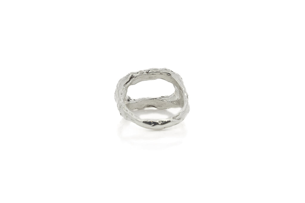 The Cinder Open Ring is a distinctive signet shape featuring an open oval cut-out and a melted, abstract texture inspired by the craters and ash cones of the Mojave Desert. Crafted from an original wax carving and cast in recycled sterling silver, this unique piece captures the raw beauty of natural formations.