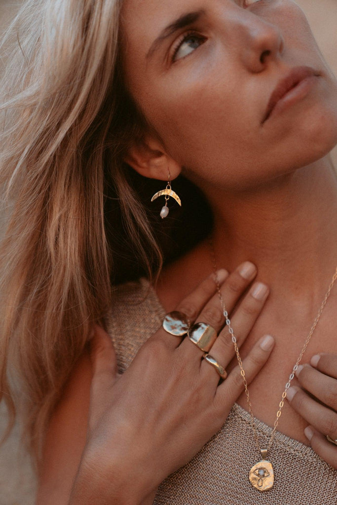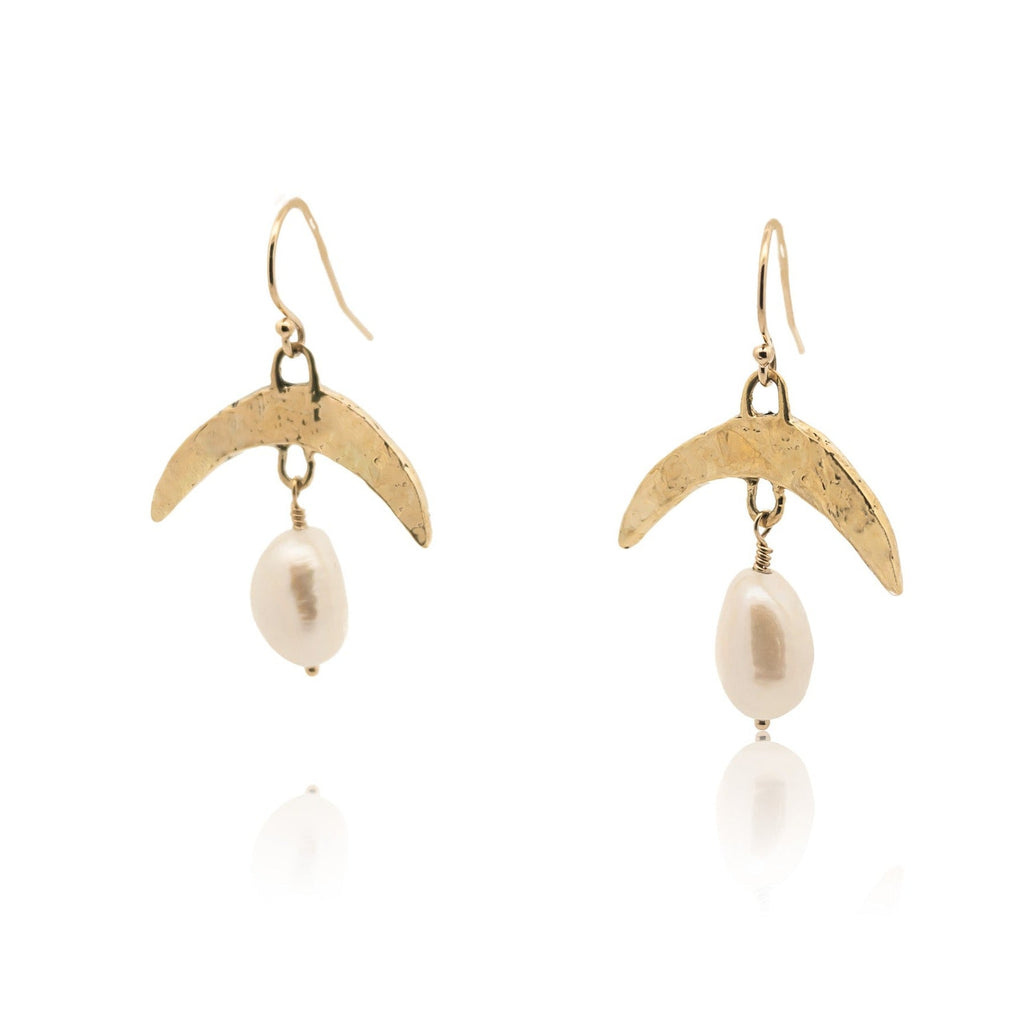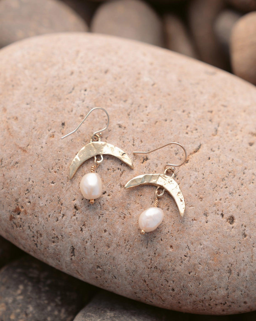 These unique Cressida Gold Pearl Moon Earrings are a sublime way to capture the power of the night sky. Hand sculpted crescent moons are adorned with drop pearl charms, they symbolize the timeless, feminine energy of the crescent moon, which has been woven into jewelry for centuries. Adorn yourself with the ultimate expression of femininity.