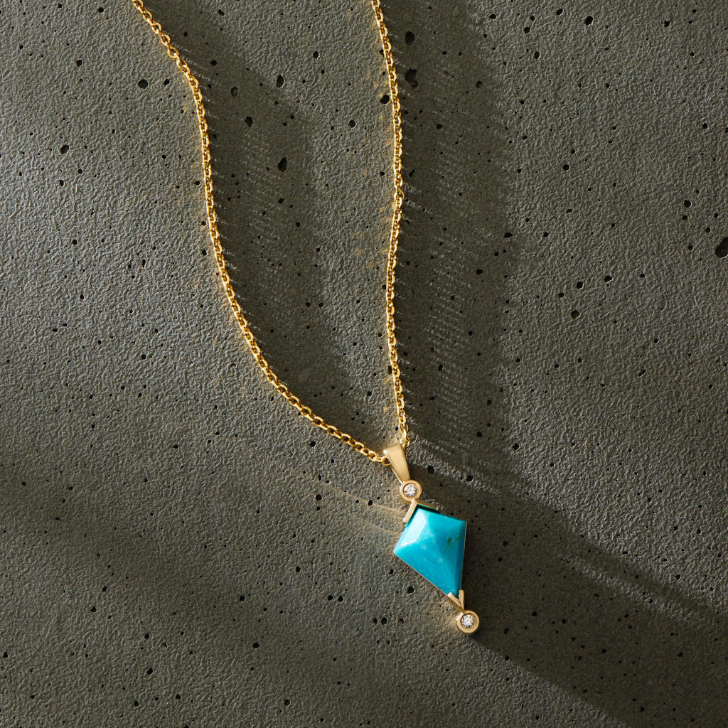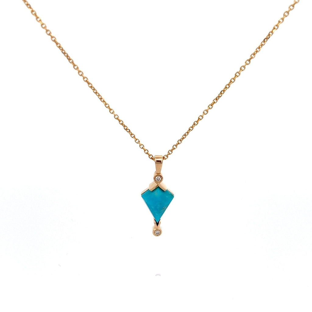 Turquoise gemstone cut in a geometric kite shape and accented with 2 small white diamonds and set in 14k yellow gold. Finished with a solid 14k solid gold cable chain with adjustable link closures at 16" and 18" long.