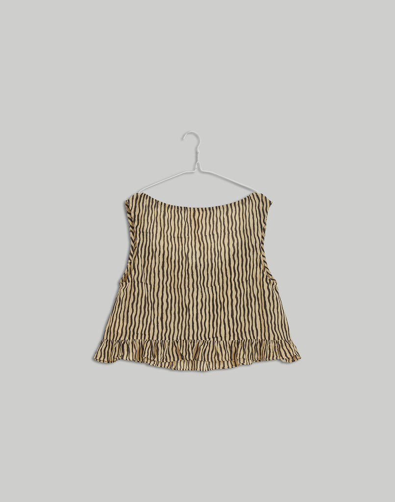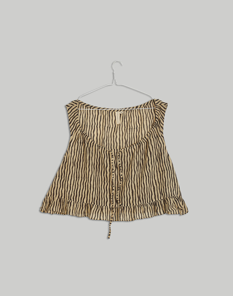 This playful and sophisticated sleeveless top, a collaboration with World of Crow, Erica, and Dee Dee, features a unique hand-drawn black and tan vertical stripe pattern. It has a gathered, ruffled neckline with a tie-front detail and a relaxed, flowy fit. Pair it with linen shorts for a casual look.
