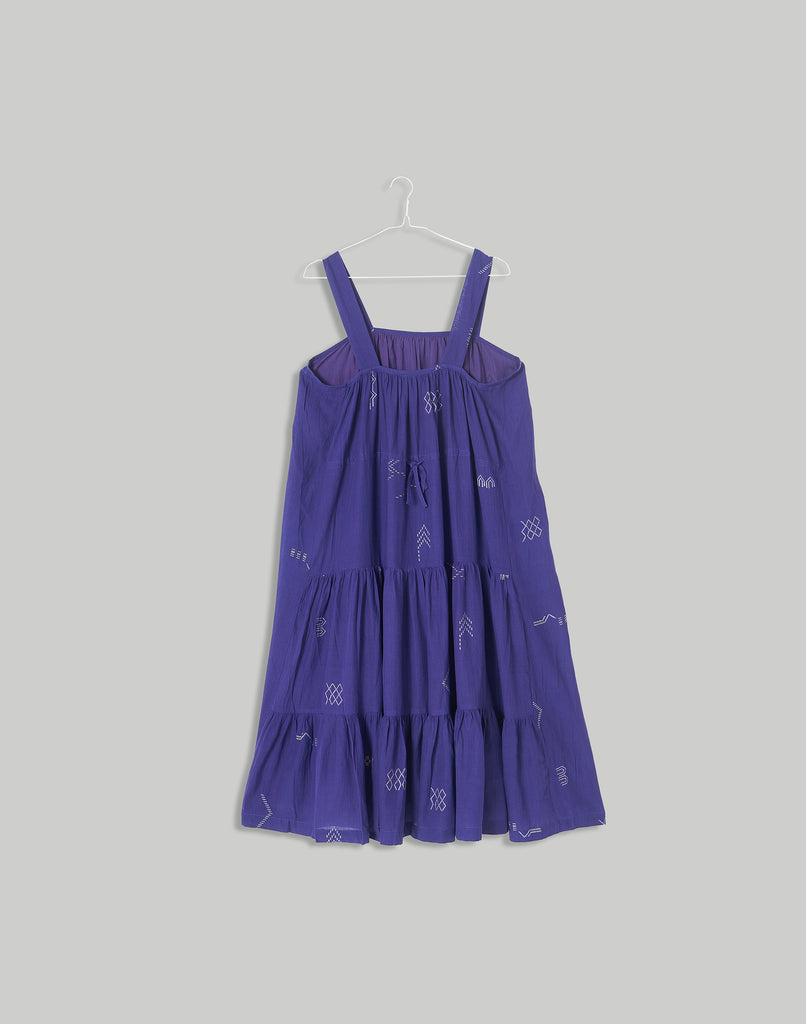 The Gemma dress, a collaboration with Erica and Dee Dee, is a long, loose-fitting indigo blue dress perfect for summer. Its bohemian charm comes from the wide straps, a gathered neckline, and a subtle pattern of scattered white abstract geometric Jamdani weaves.