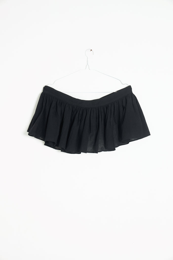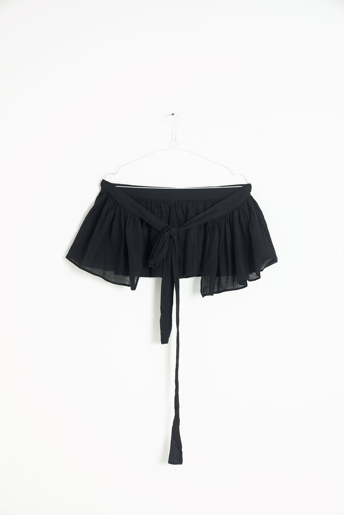 This black ruffle tie-up is a versatile accessory designed to elevate any outfit. It features a full, layered ruffle that creates a voluminous silhouette around the waist, while the front tie allows for a custom, adjustable fit. The solid black color makes it easy to style; simply layer it over a crisp button-down shirt and tailored trousers for a sharp, modern look, or cinch it over a simple dress or even a tee and jeans to instantly add a touch of drama.
