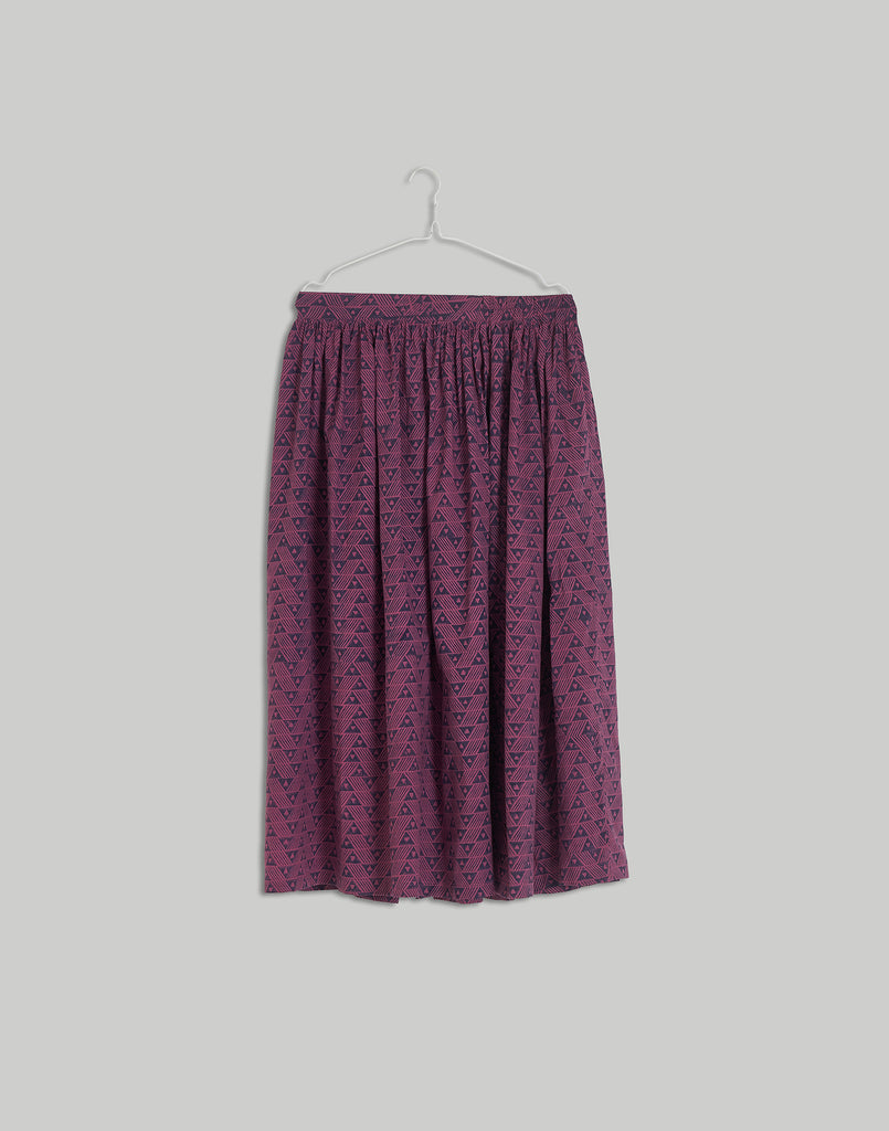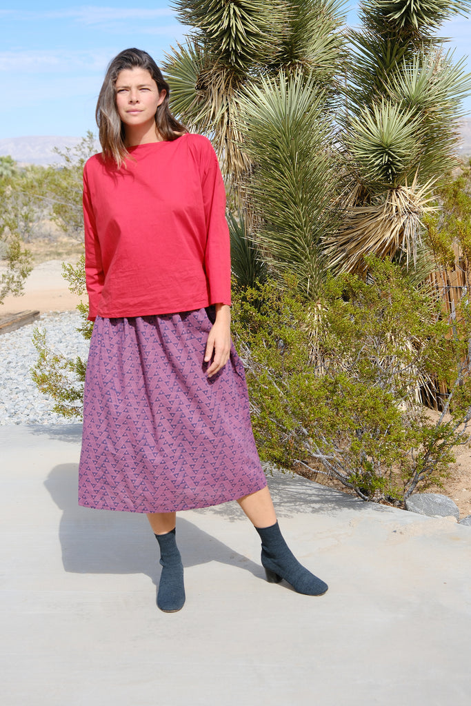 Designed in collaboration with Meredith Peck, this hand-block printed skirt is a rich magenta color. It features a unique geometric pattern of triangles and a voluminous, flowing silhouette. The gathered skirt has an elasticated waist and pockets, creating a relaxed and bohemian feel.