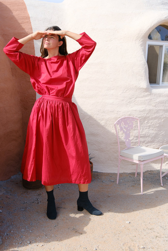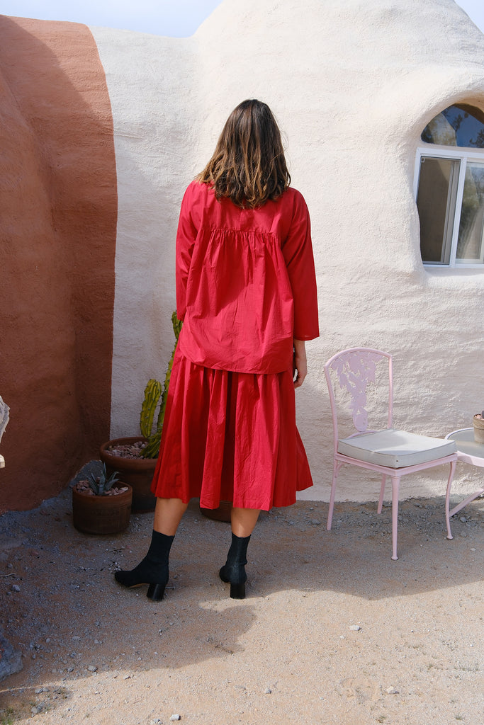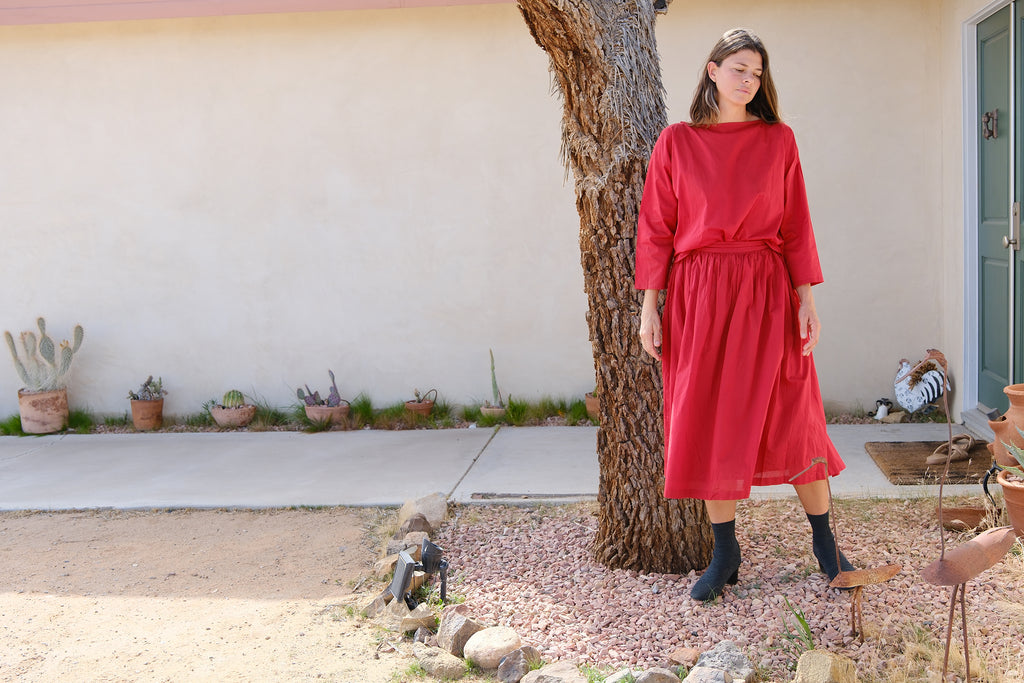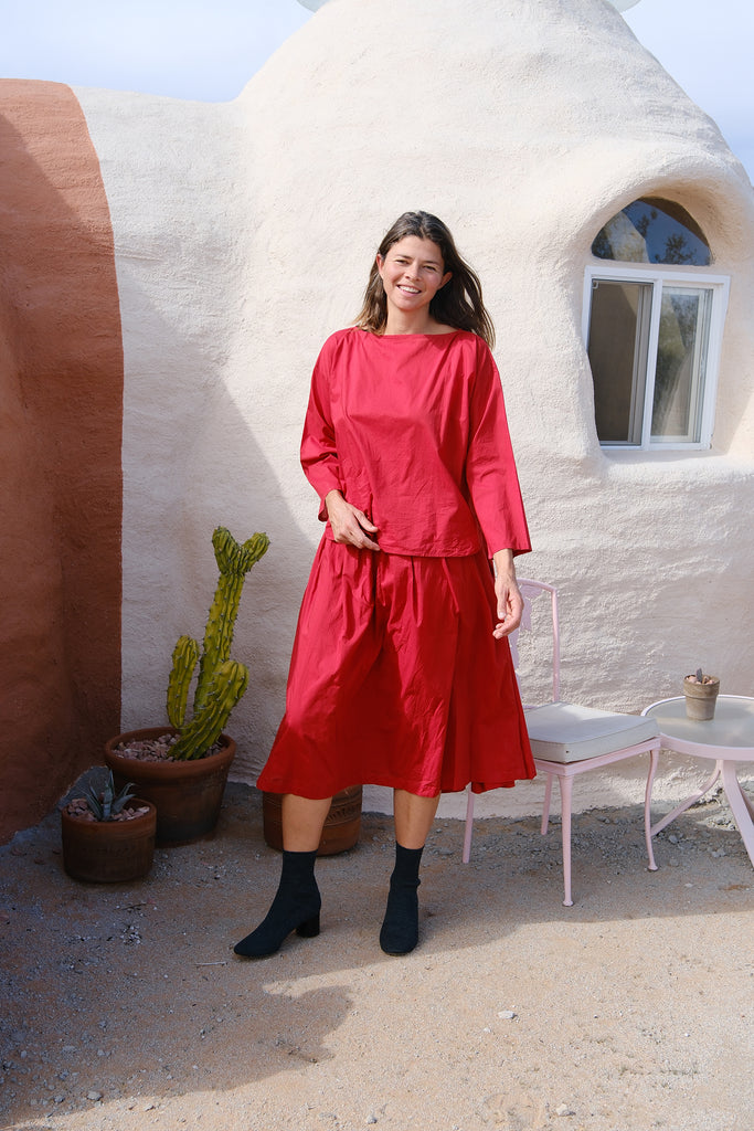 Designed in collaboration with Meredith Peck, this chic red top offers a relaxed, comfortable fit with a flattering boat neckline with a single button closure at the back and a wide, flowing silhouette. The modern high-low hemline and 3/4 length sleeves make it a versatile piece for effortless style.