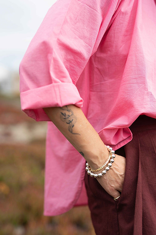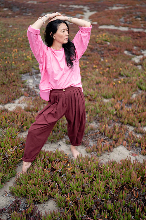 Designed In collaboration with Meredith Peck, this vibrant pink top offers a relaxed, comfortable fit with a flattering boat neckline with a single button closure at the back and a wide, flowing silhouette. The modern high-low hemline and 3/4 length sleeves make it a versatile piece for effortless style.