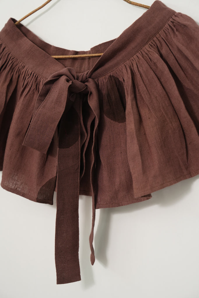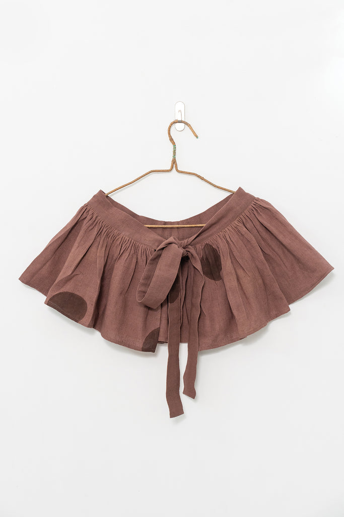 Playful and sculptural, this short wrap frill is designed in collaboration with Meredith Peck. The bold dot pattern is hand-block printed on handwoven organic cotton using azo-free dyes. The wide waistband and soft gathers create a flattering flared shape that ties effortlessly at the waist — a modern nod to feminine ease.