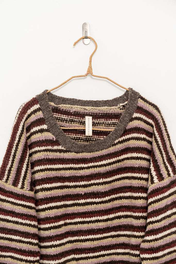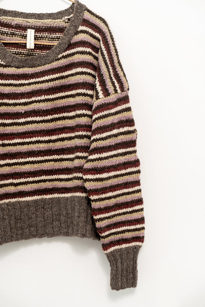 Inspired by mountain dusk, the Rustfield Sweater is crafted from naturally dyed Himalayan wool in deep charcoal, moss green, lilac, and cream stripes. Hand spun and hand knit by our women artisans, each piece carries its own unique texture and character. Natural dye variations create gentle irregularities, giving the sweater its raw, grounded, and softly nubby feel — unmistakably handmade.