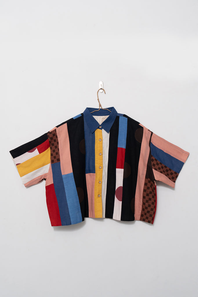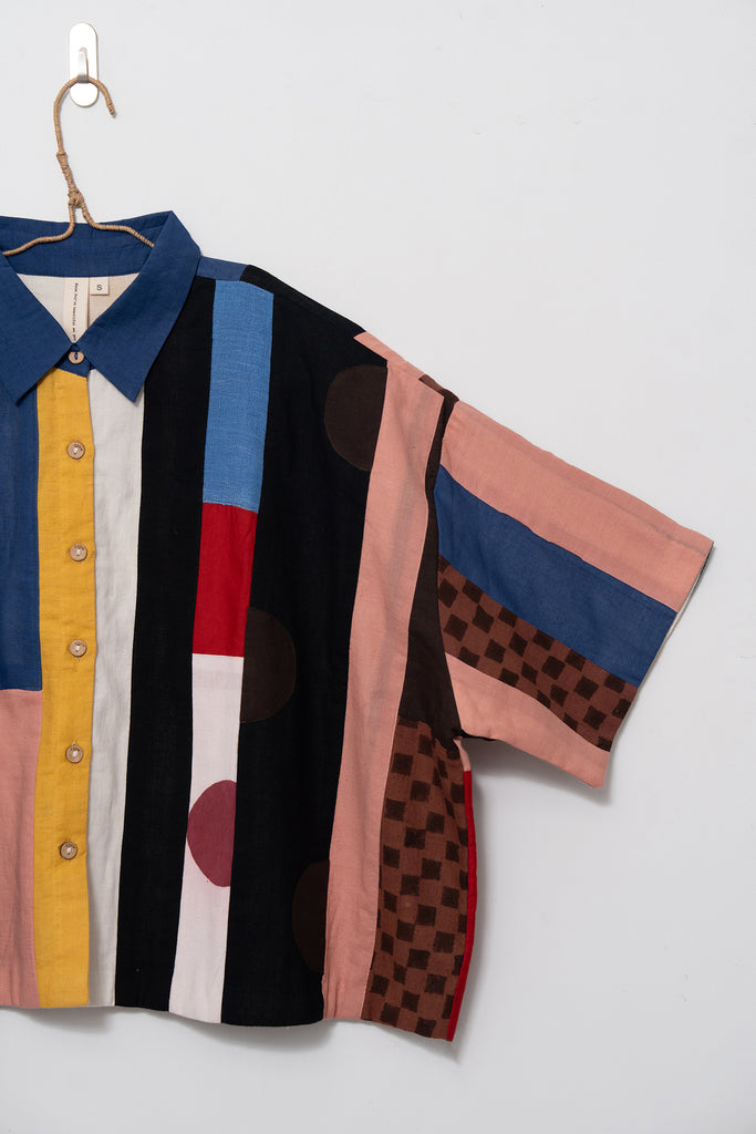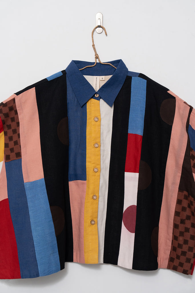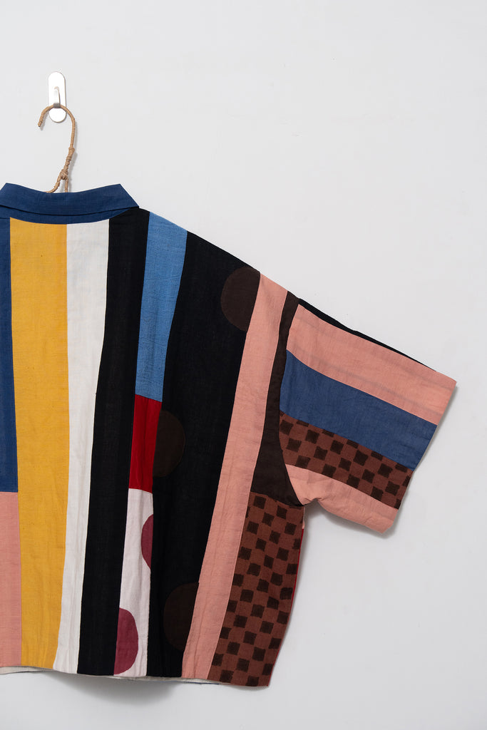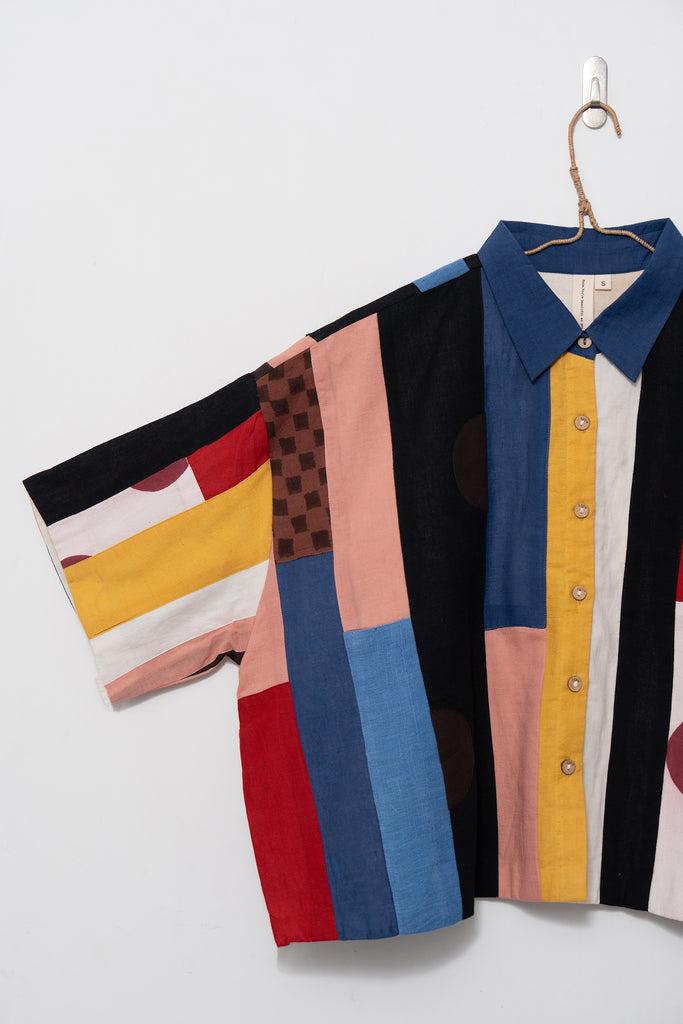 A joyful patchwork shirt inspired by the rhythm of San Francisco streets. Playful panels meet soft structure in a relaxed, boxy silhouette. Handcrafted from breathable organic cotton, it moves with quiet confidence through every season.