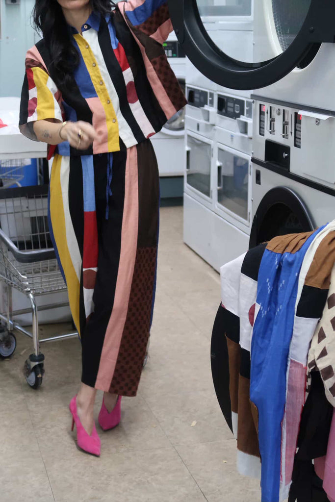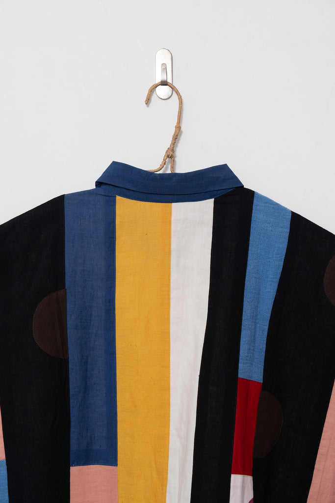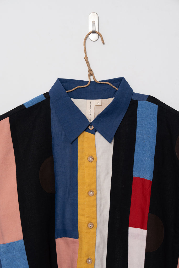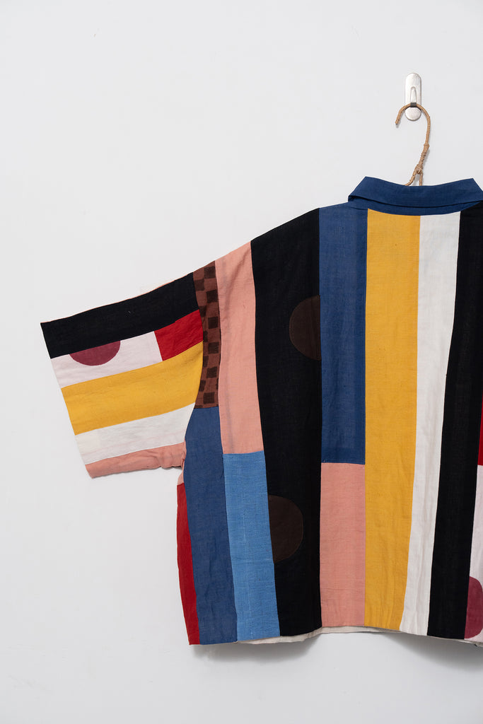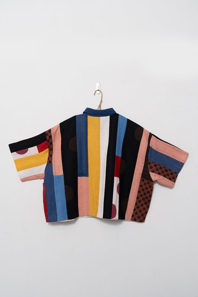 A joyful patchwork shirt inspired by the rhythm of San Francisco streets. Playful panels meet soft structure in a relaxed, boxy silhouette. Handcrafted from breathable organic cotton, it moves with quiet confidence through every season.