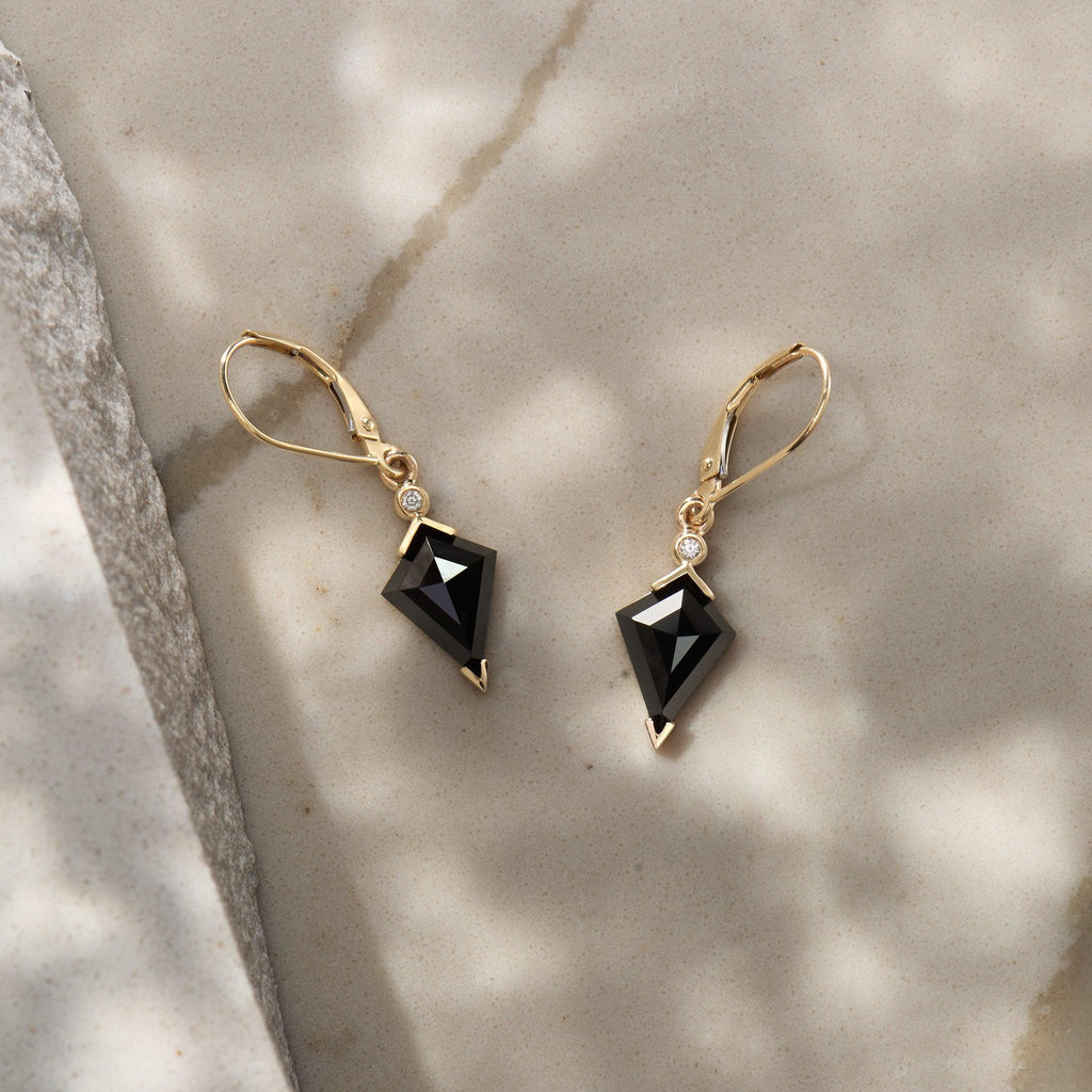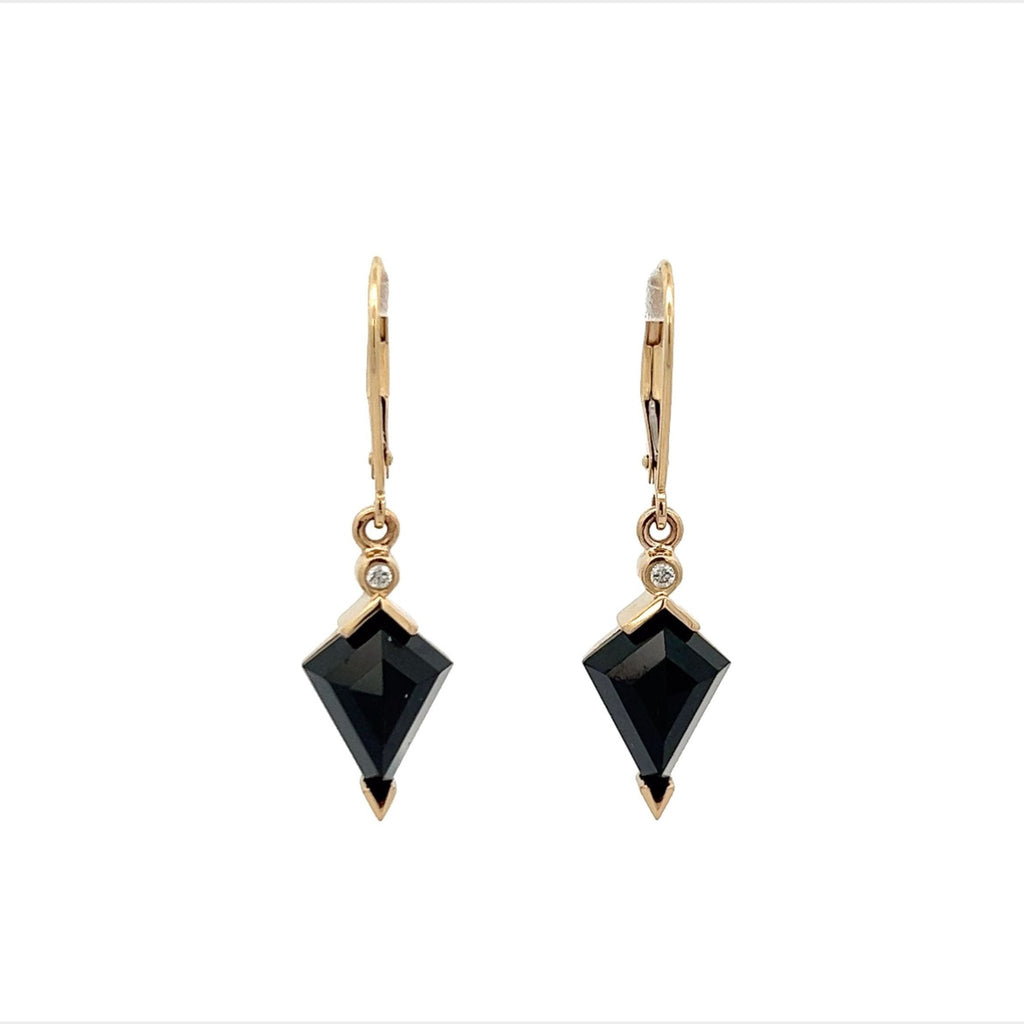 Black Spinel gemstone cut in a geometric kite shape, accented with a small white diamond and set in 14k yellow gold. Finished with a 14k solid gold leverback earwire to ensure the earrings security.