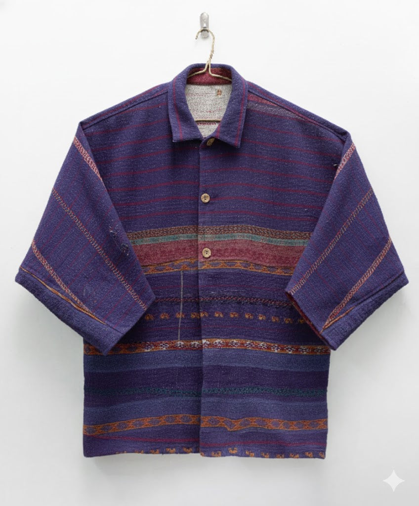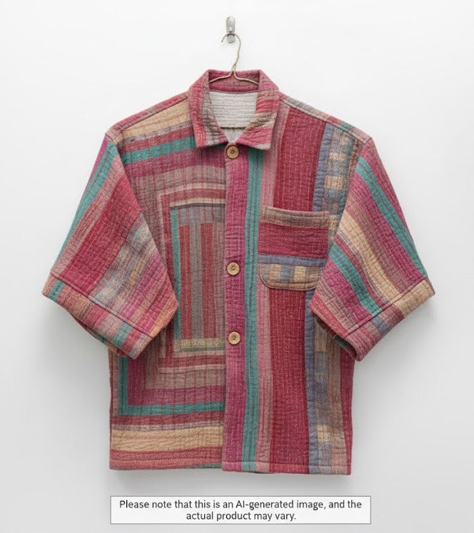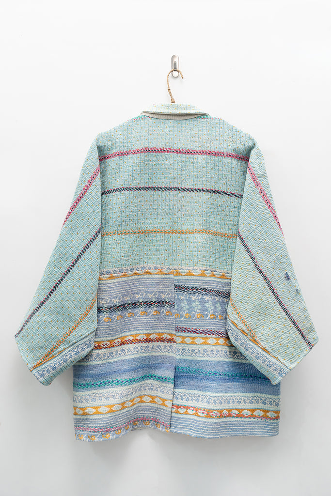 A tapestry of stories — pieced from vintage kantha quilts, this jacket blends deep plum stripes with vibrant bands of red, teal, and ochre. It’s a lightweight yet warm layer, made for crisp fall days, cool evenings, and slow mornings when comfort feels like a ritual. Every stitch carries history; every color holds a memory.