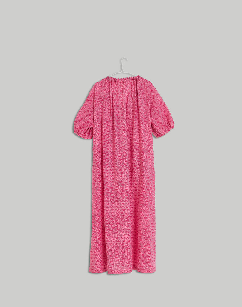 In collaboration with Meredith Peck, this elegant block printed pink dress combines a comfortable, flowing style with a beautifully ruched bodice and an adjustable V-neckline with a front tie up. The romantic, puffy short sleeves add a touch of flair, making this a versatile piece for a relaxed, daytime look.
