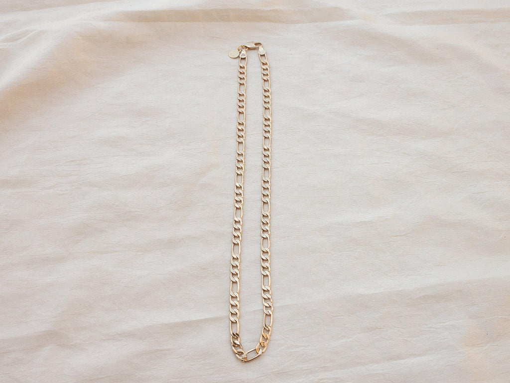 A thick and bold Figaro chain that just says BOSS. Necklace width measures 5.5mm and is 20" long. This gender neutral gold-filled chain complements so many looks. Don't be shy to layer it up.