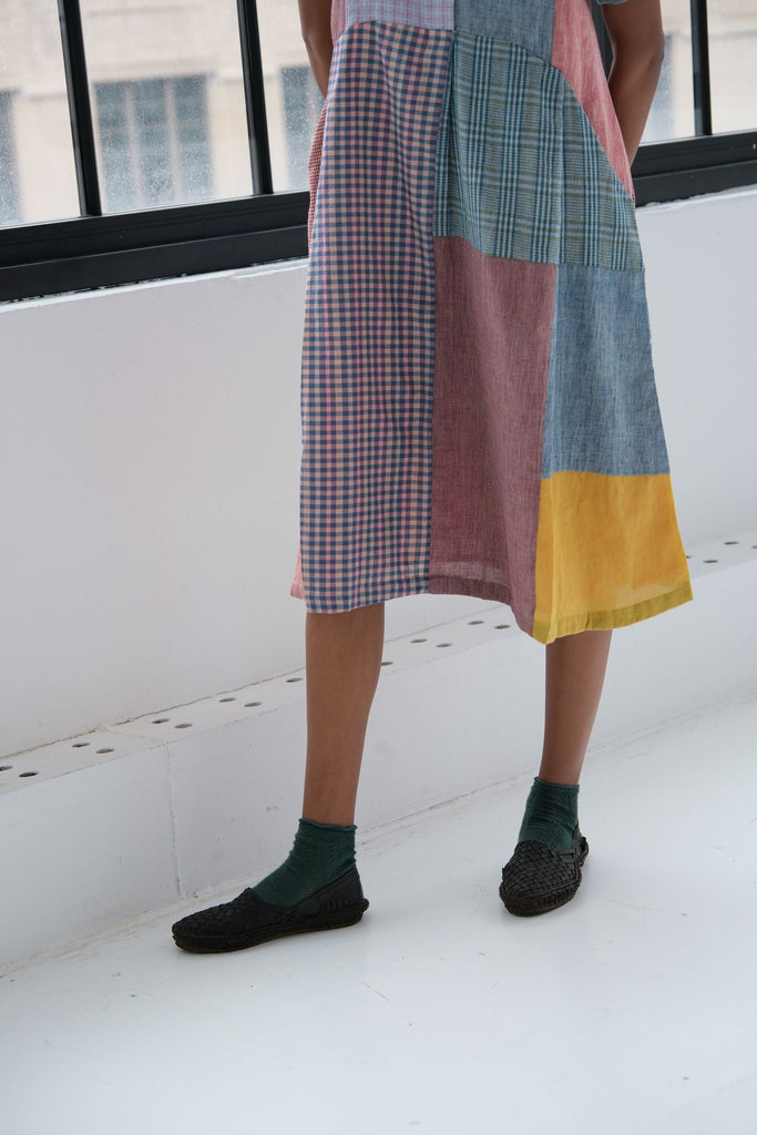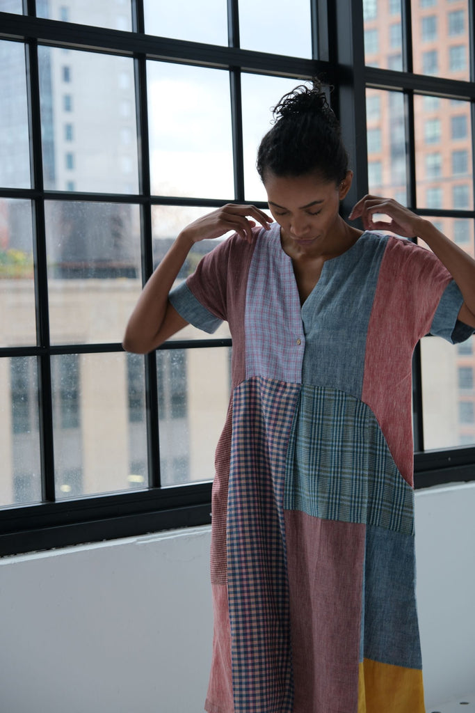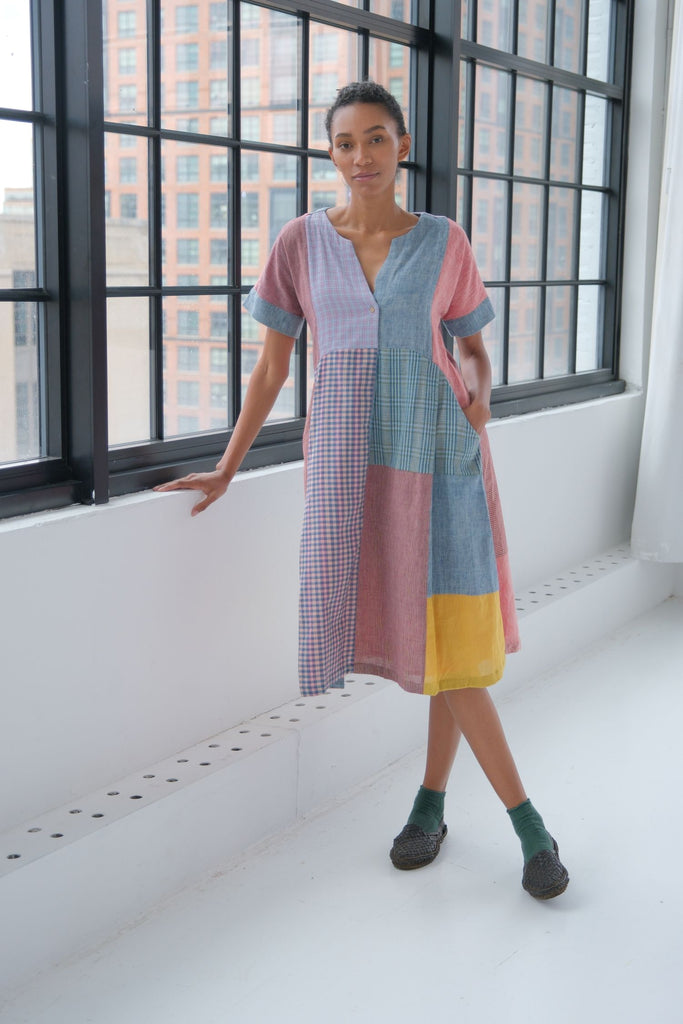 An heirloom in motion — this knee-length tunic dress is created from an intricate patchwork of various handloom textiles, offering a colorful, one-of-a-kind design. It features squares and rectangles of solid mauve, denim blue, maroon, and mustard, interspersed with plaid and gingham checks in complementary tones. The dress has a relaxed, boxy silhouette, short sleeves, and a simple V-neck with a short button placket, showcasing the beauty of textile remnants.